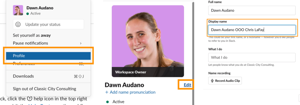 - Change your Display Name to Your Name OOO Covering Team Member. (ex: Chris LaFay OOO Dawn Audano). This way, people know who has been briefed and can address the question or concern.